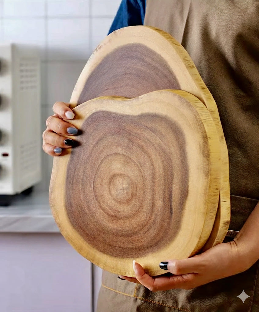 Cada pieza conserva la forma natural de la madera, tratada para realzar su veta y durabilidad. Sin adornos, solo la materia en su estado más honesto".